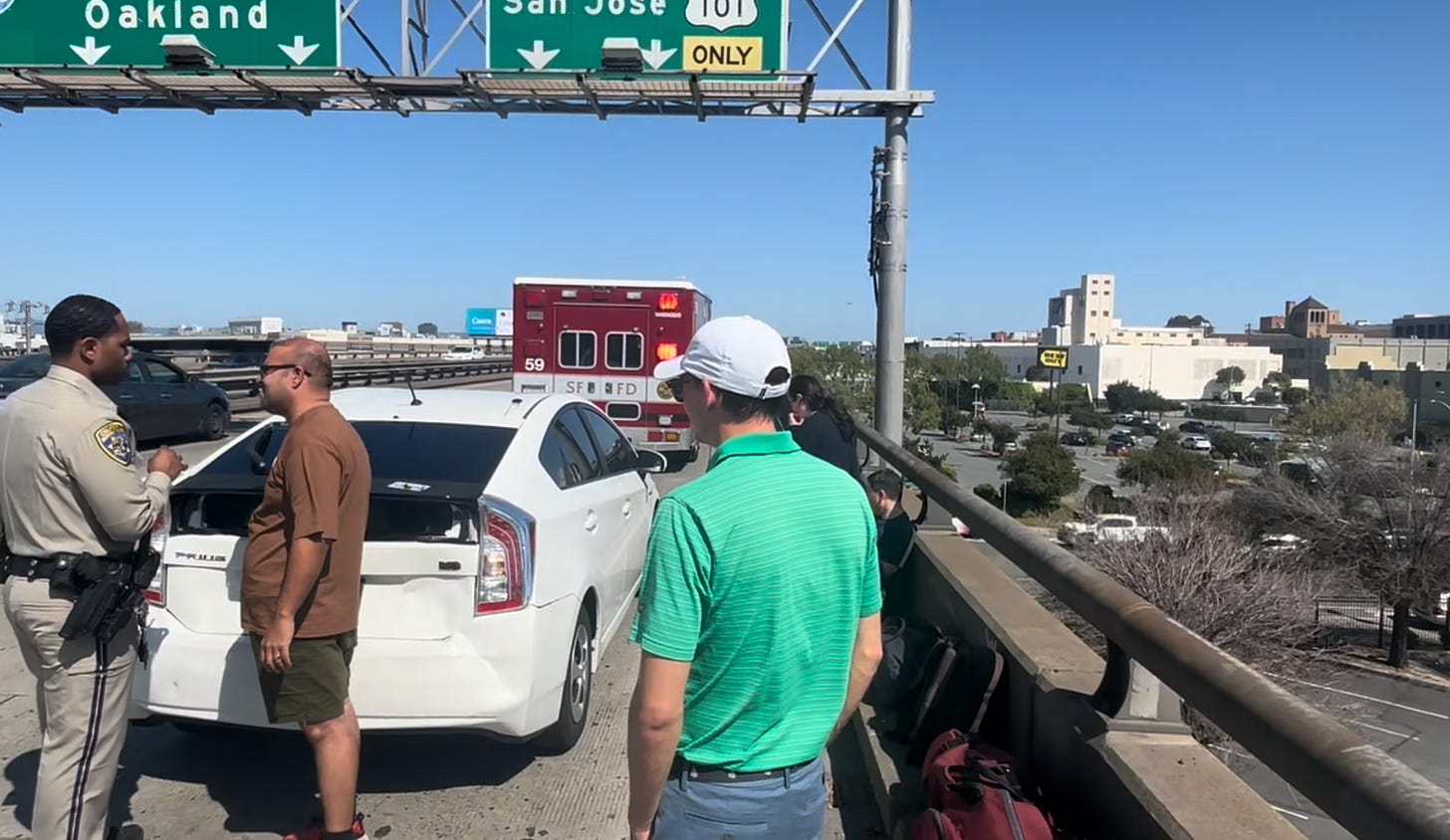 Ambulance called. What exit of the highway are we on? No I’m not from here. Police statements taken. Yes, we need to get to the airport. Another trooper asked us if we needed a ride. I asked if he had room for two travel golf bags and he popped his trunk to show off an AR-15 in a case. Not today, bud. Tom piled in the back with both bags even though I’m substantially the smaller of the two. He’s that kind of friend.